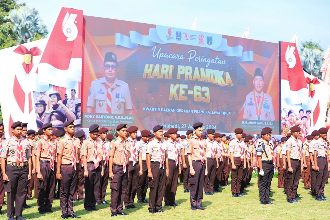 Hal tersebut disampaikan Pj. Gubernur Adhy selaku Ketua Majelis Pembimbing Daerah (Mabida) Pramuka Jatim saat memimpin upacara Peringatan Hari Pramuka Ke-63 di Gedung Negara Grahadi Surabaya, Selasa (27/8).