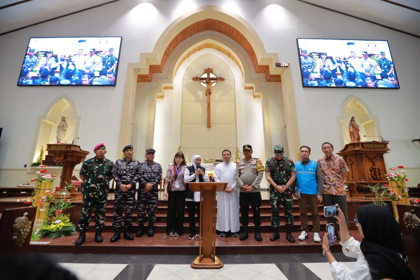Sebelum prosesi Misa dimulai, Gubernur Jawa Timur menyampaikan ucapan selamat Natal kepada seluruh jemaat serta mengajak seluruh elemen masyarakat untuk terus menjaga suasana damai dan persaudaraan. “Selamat Natal, selamat menjemput Tahun Baru 2026. Mudah-mudahan bahagia, damai, dan sukses. Kami bersama Forkopimda Provinsi Jawa Timur berharap suasana damai dan persaudaraan senantiasa terjaga,” ujar Khofifah.